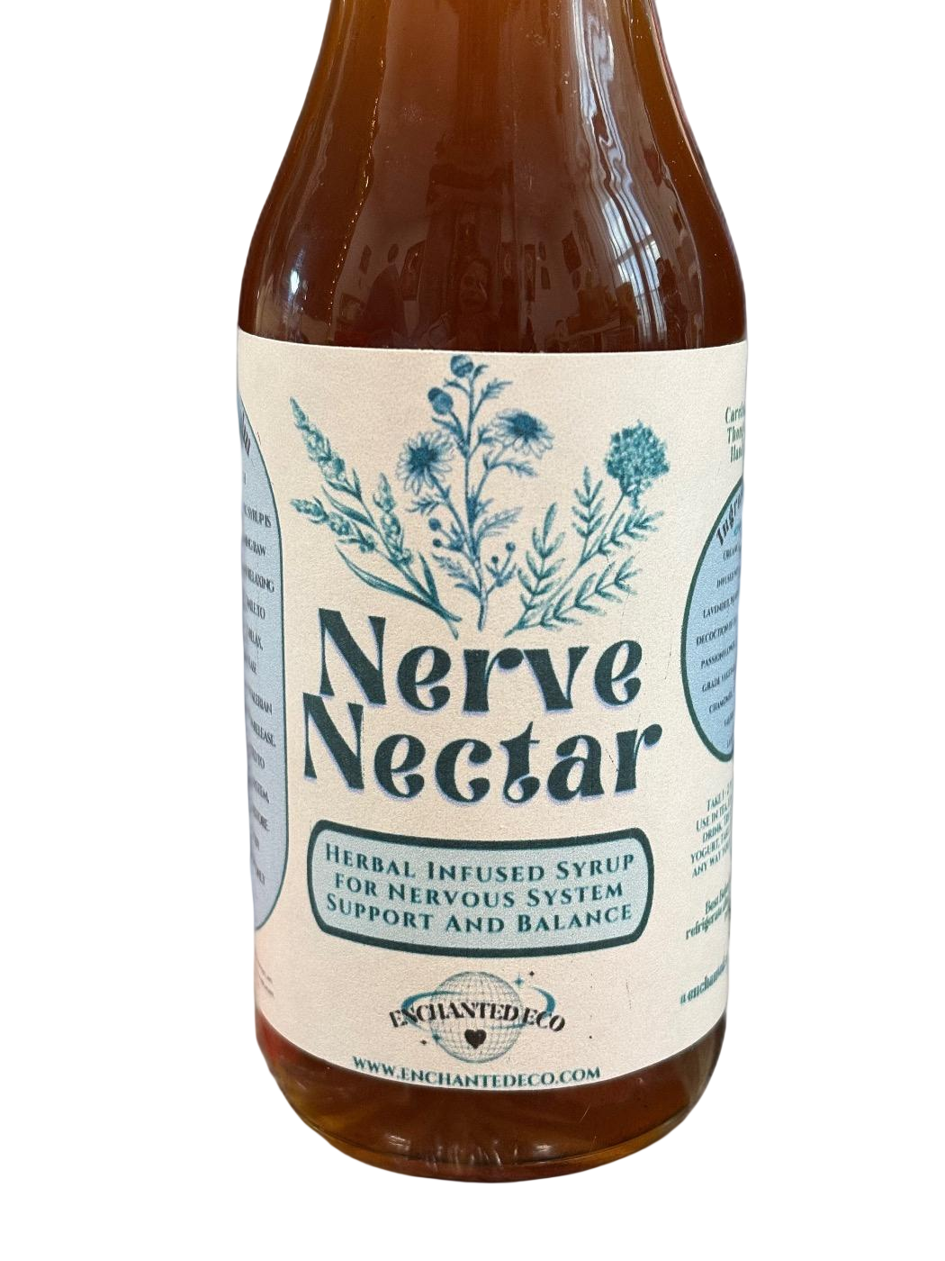 Nerves Nectar includes chamomile, lavender, passionflower, and valerian root. These calming herbs are relaxing nervines and have long been cherished for their gentle, comforting energy and holistic benefits for our nervous system- perfect for inviting moments of bliss and ease.